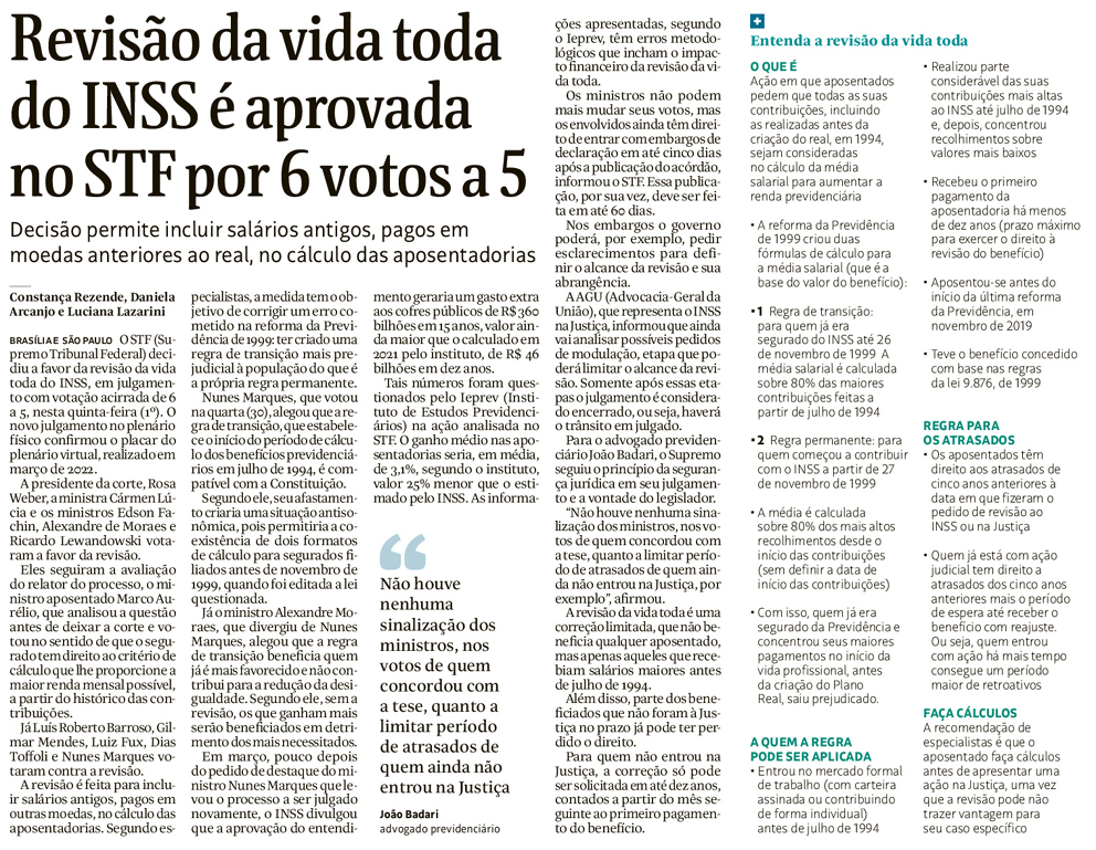 Revisão da vida toda do INSS é aprovada no STF por 6 votos a 5