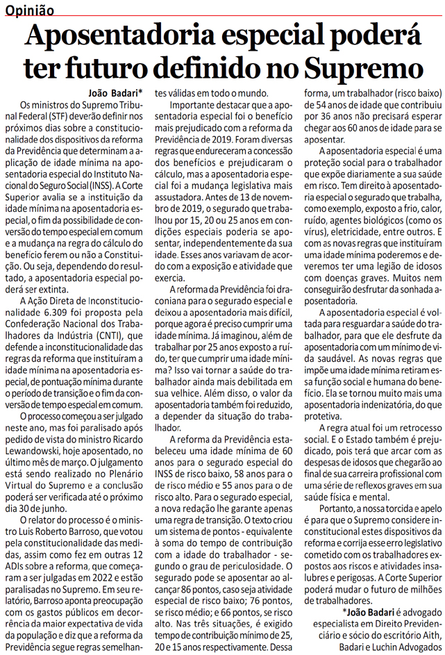 Opinião - Aposentadoria especial poderá ter futuro definido no Supremo