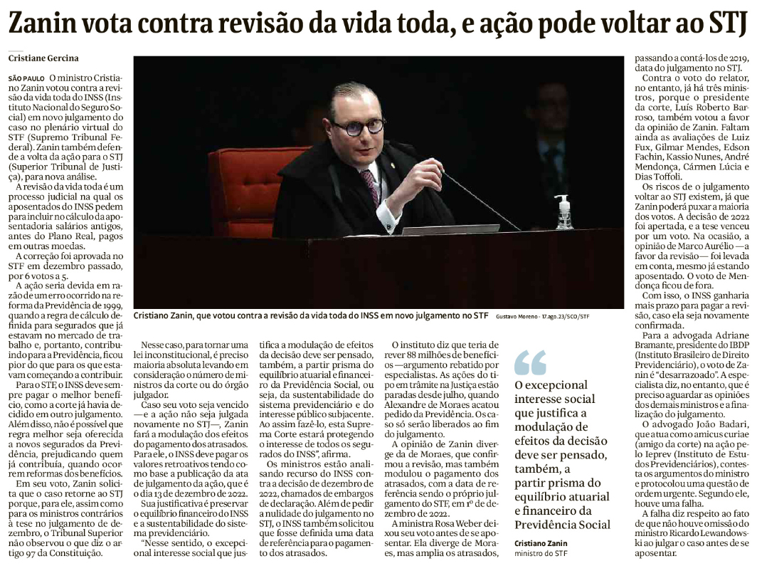 Zanin vota contra revisão da vida toda, e ação pode voltar ao STJ