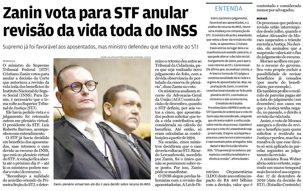 Zanin vota para STF anular a revisão da vida toda do INSS