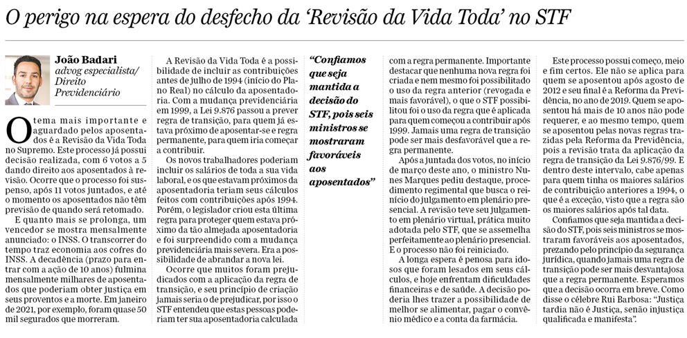 O perigo na espera do desfecho da Revisão da Vida Toda no STF