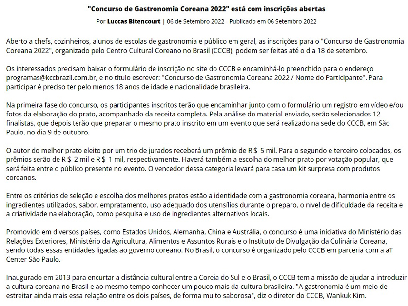 Concurso de Gastronomia Coreana 2022 está com inscrições abertas