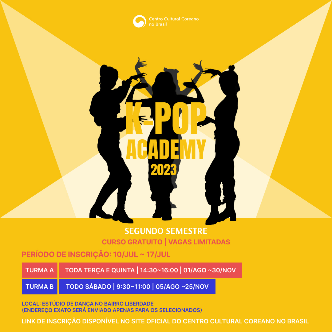 Estão abertas as inscrições para curso “K-Pop Academy 2023”, do Centro Cultural Coreano no Brasil (CCCB). Gratuito, serão formadas duas turmas para aulas as terças e quintas-feiras, das 14h30 às 16h, entre 1º de agosto e 30 de novembro, ou apenas aos sábados, das 09h30 às 11h, de 05 de agosto a 25 de novembro. Os interessados devem se inscrever até o dia 17 de julho, pelo site da instituição.