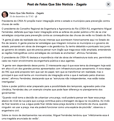 Presidente do CREA-RJ propõe maior integração entre o estado e municípios para prevenção contra chuvas de verão