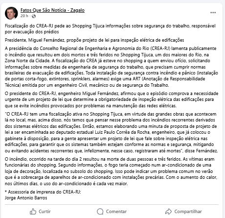 Fiscalização do CREA-RJ pede ao Shopping Tijuca informações sobre segurança do trabalho, responsável por evacuação dos prédios