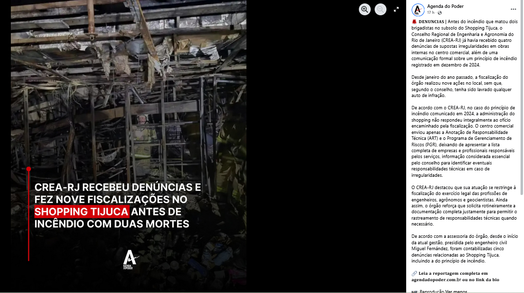 CREA-RJ diz que recebeu denúncias sobre obras no Shopping Tijuca antes do incêndio