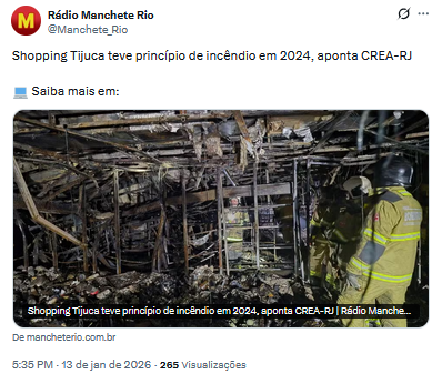 Shopping Tijuca teve princípio de incêndio em 2024, aponta CREA-RJ