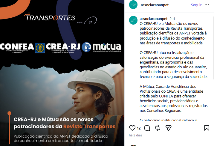 Veículo: Online -> Instagram -> Instagram ANPET - Associação Nacional de Pesquisa e Ensino em Transportes