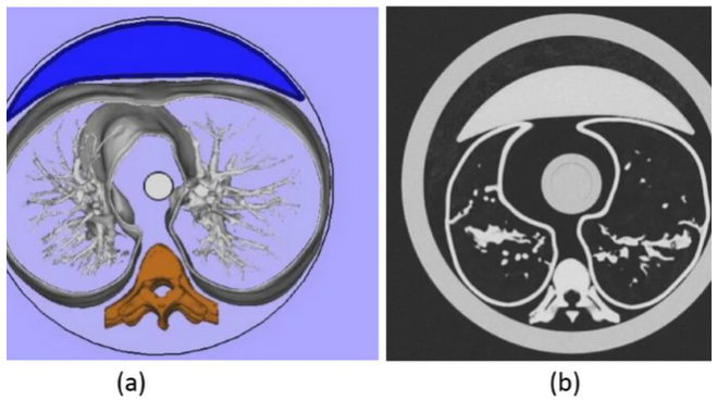 LEGENDA DA IMAGEM: Peças de tecido mole em formato de meia-lua foram impressas em ABS, preenchidas com resina e incorporadas na parte anterior de cada seção para simular a atenuação dos músculos peitorais (Figura a). Imagens da coluna torácica de um paciente foram segmentadas, modeladas e impressas em 3D e essas peças foram localizadas na posição correspondente a um paciente real - uma varredura axial de um dos módulos totalmente montados é mostrada na Figura b.