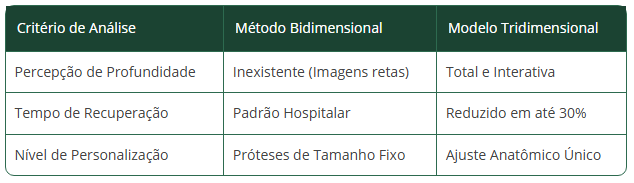 A ortopedia foi uma das áreas que mais rapidamente absorveu a inovação, pois a reconstrução óssea exige um ajuste mecânico perfeito para o sucesso da funcionalidade motora. Além disso, a criação de moldes e guias de corte personalizados evita que o cirurgião precise fazer ajustes manuais imprecisos durante a operação, o que reduz o trauma tecidual. A tabela abaixo compara os métodos tradicionais com as novas abordagens tridimensionais.