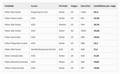 O curso mais concorrido desta edição foi Engenharia Civil, oferecido pela Fatec São Paulo no período noturno. Inédito no CPS, o curso registrou 50,40 candidatos por vaga — foram 1.260 inscritos para apenas 25 vagas. Na sequência, cursos de Análise e Desenvolvimento de Sistemas (ADS) dominaram oito das dez maiores demandas do vestibular, além do destaque para Gestão Empresarial (EaD).