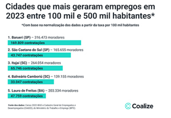 Já reconhecido por sua qualidade de vida, São Caetano se destaca nacionalmente comoum polo de geração de empregos no regime da CLT em 2023. Segundo dados do CAGED –Cadastro Geral de Empregados e Desempregados, analisados e normalizados pela equipeda Coalize, a cidade é a segunda com população entre 100 e 500 mil habitantes que maiscontratou no ano.