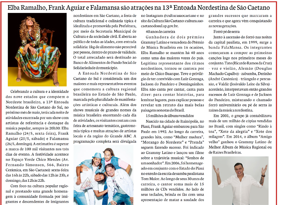 Elba Ramalho, Frank Aguiar e Falamansa são atrações na 13ª Entoada Nordestina de São Caetano