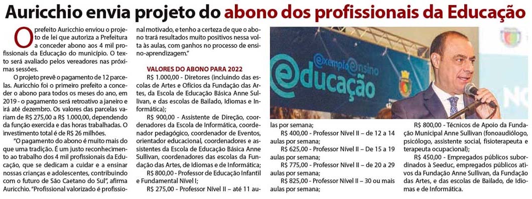Auricchio envia projeto do abono dos profissionais da Educação à Câmara