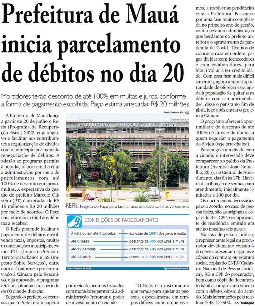 Prefeitura de Mauá inicia parcelamento de débitos no dia 20