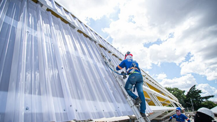 A nova cobertura metálica está sendo instalada acima das lajes de concreto recém-reformadas, eliminando os problemas anteriores, cobrindo os vãos da antiga estrutura e servindo de base para a instalação de paineis de energia solar, que em breve serão integrados à rede elétrica do terminal.