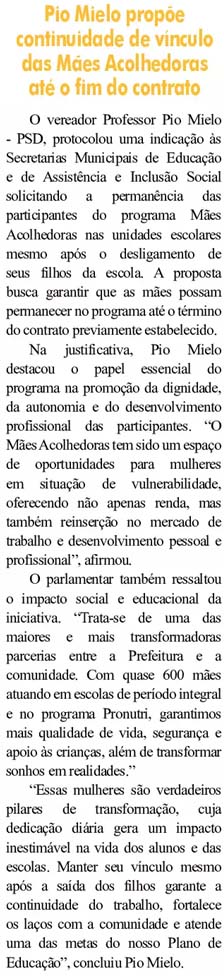 Pio Mielo propõe continuidade de vínculo das Mães Acolhedoras até o fim do contrato