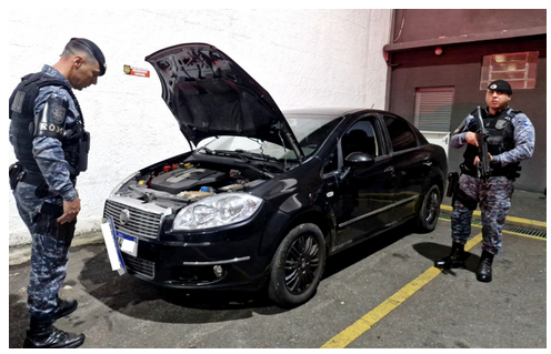 Durante a ação, os GCMs avistaram um Fiat Linea preto com uma das placas deslocada do seu ponto original, revelando outra por baixo. A equipe realizou a abordagem e, ao verificar o veículo, constatou que a placa traseira também sobrepunha outra. As duas placas adulteradas eram de automóveis diferentes. Questionado, o condutor do veículo não soube explicar o motivo da adulteração.