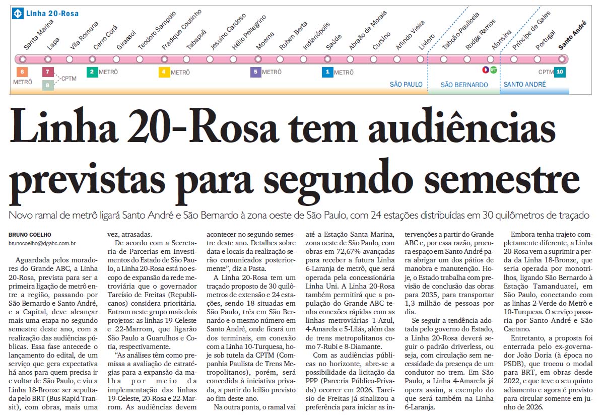 Linha 20-Rosa tem audiências previstas para segundo semestre