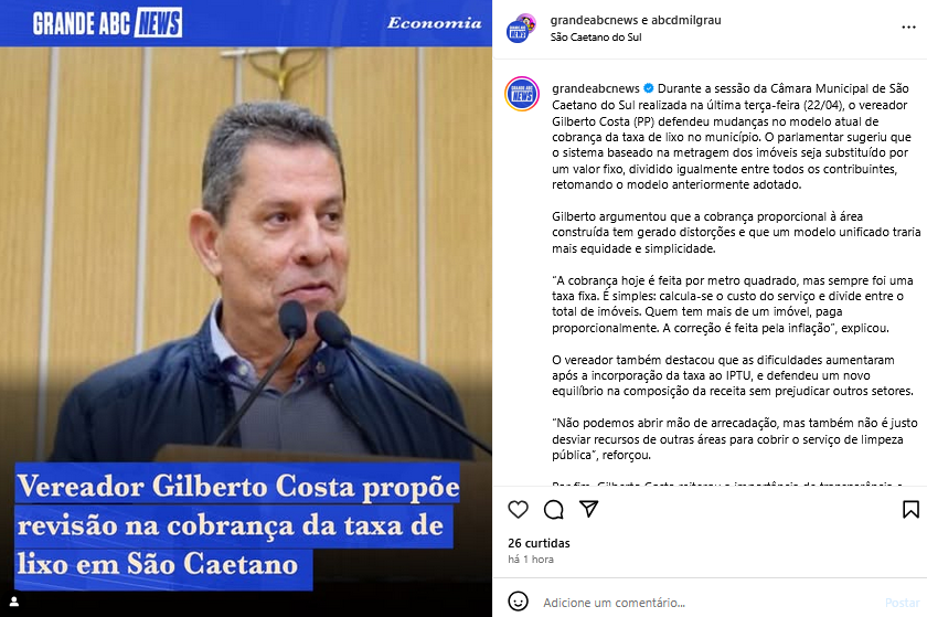 Vereador Gilberto Costa propõe revisão na cobrança da taxa de lixo em São Caetano