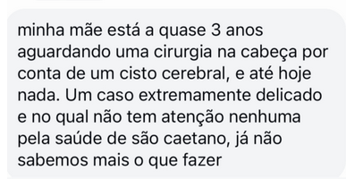 Uma mulher idosa há quase três anos aguarda por uma cirurgia na cabeça. Ela precisa retirar um cisto cerebral, mas nenhuma resposta é dada.