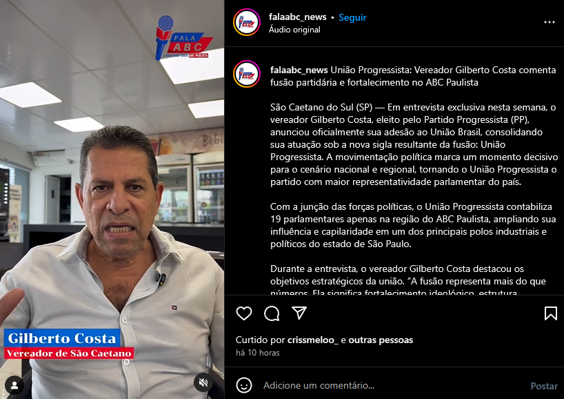 Vereador Gilberto Costa comenta fusão partidária e fortalecimento no ABC Paulista