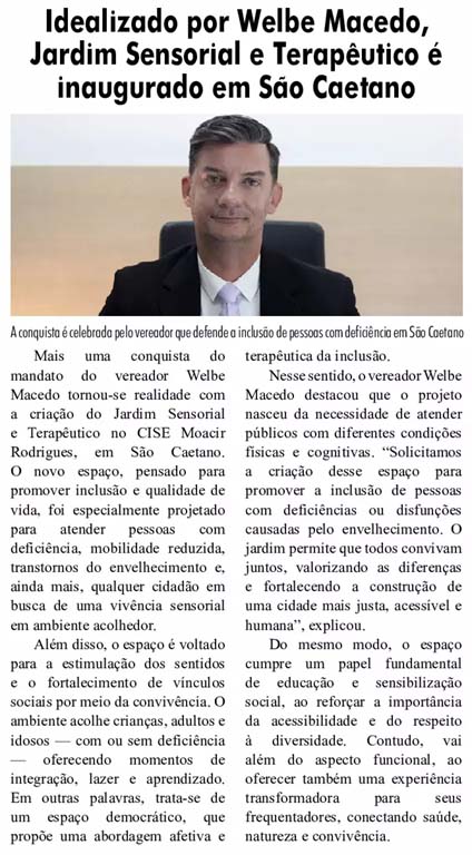 Idealizado por Welbe Macedo, Jardim Sensorial e Terapêutico é inaugurado em São Caetano