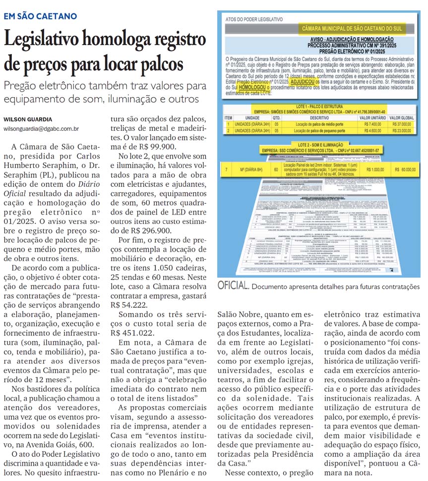 Legislativo homologa registro de preços para locar palcos