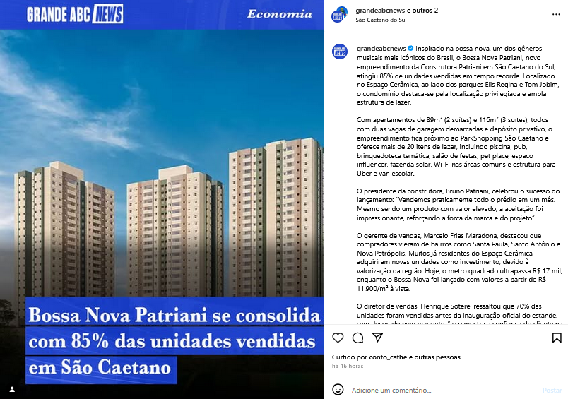 Bossa Nova Patriani se consolida com 85% das unidades vendidas em São Caetano
