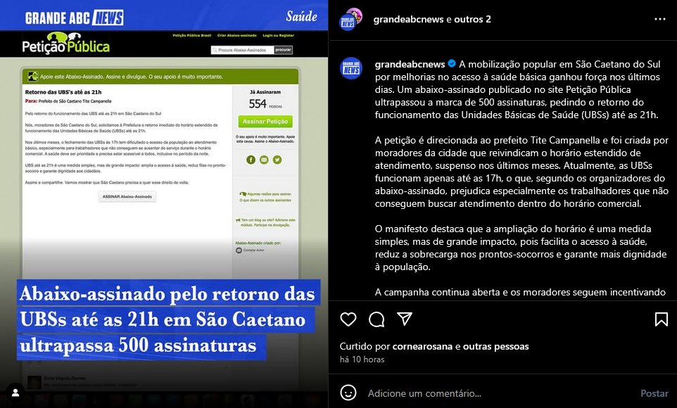 Abaixo-assinado pelo retorno das UBSs até às 21h em São Caetano ultrapassa 500 assinaturas