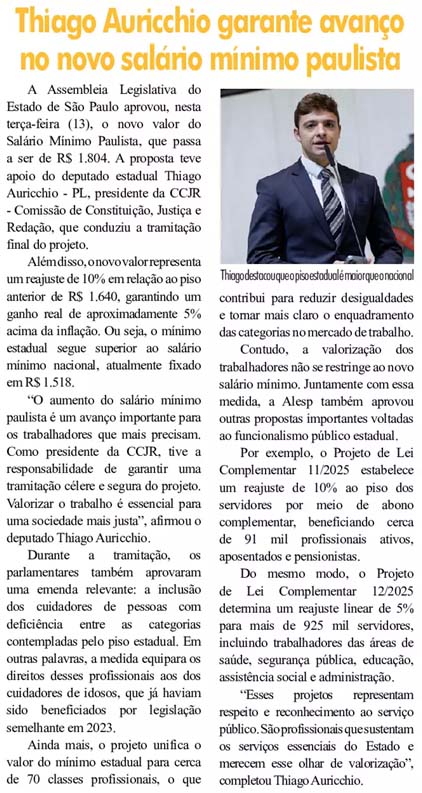 Thiago Auricchio garante avanço no novo salário mínimo paulista