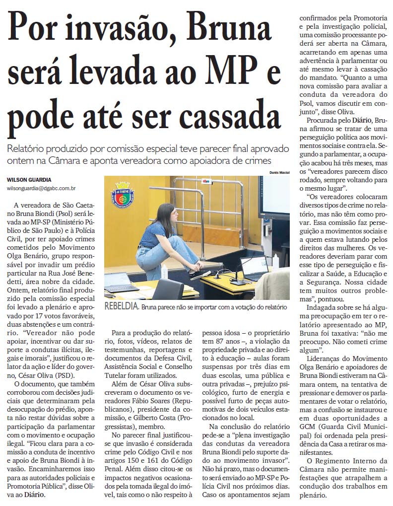 Por invasão, Bruna será levada ao MP e pode até ser cassada