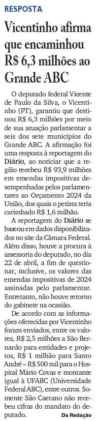 Vicentinho afirma que encaminhou R$ 6,3 milhões ao Grande ABC