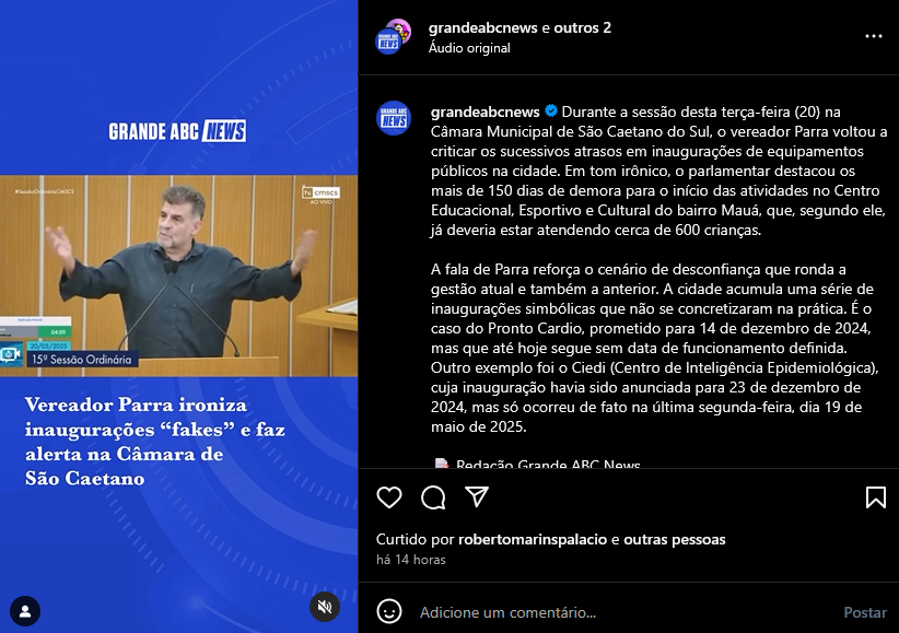 Vereador Parra ironiza inaugurações "fakes" e faz alerta na Câmara de São Caetano