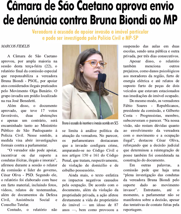 Câmara de São Caetano aprova envio de denúncia contra Bruna Biondi ao MP
