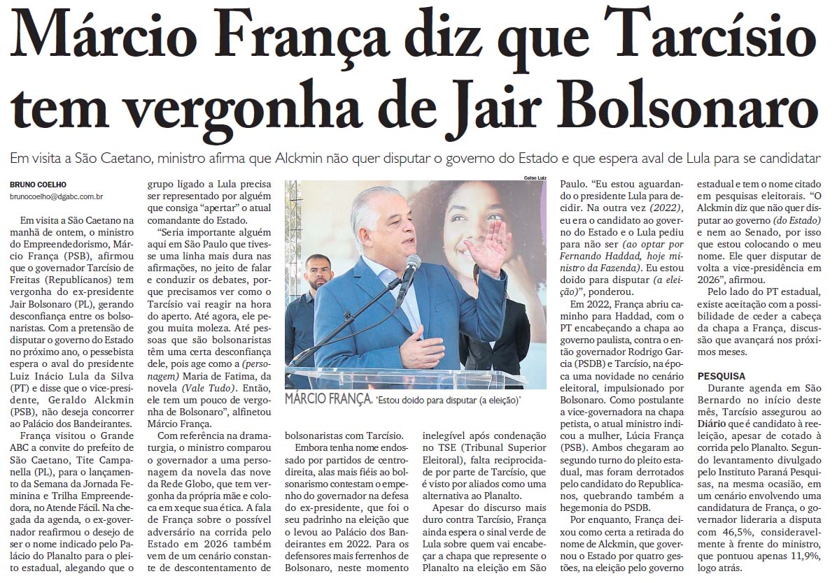 Márcio França diz que Tarcísio tem vergonha de Jair Bolsonaro