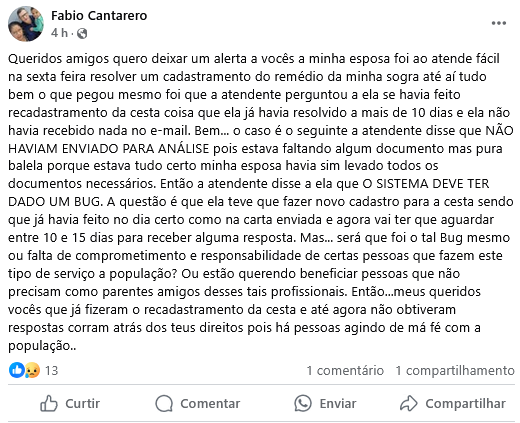 Morador reclama de recadastramento em Atende Fácil
