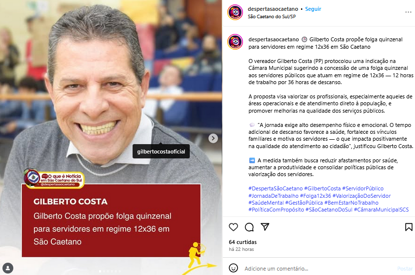 Gilberto Costa propõe folga quinzenal para servidores em regime 12x36 em São Caetano