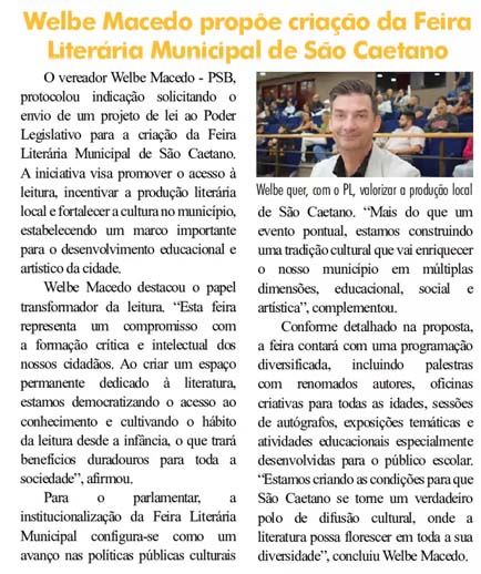 Walbe Macedo propõe criação da Feira Literária Municipal de São Caetano