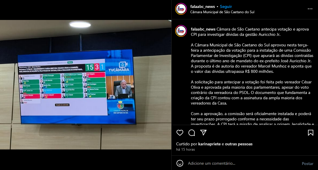 Câmara de São Caetano antecipa votação e aprova CPI para investigar dívidas da gestão Auricchio Jr.