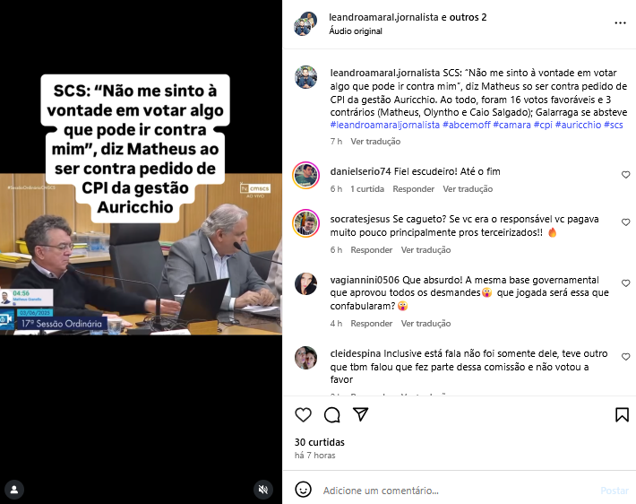 SCS: “Não me sinto à vontade em votar algo que pode ir contra mim”, diz Matheus ao ser contra pedido de CPI da gestão Auricchio