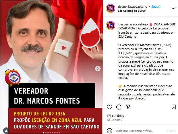 Projeto de Lei propõe isenção em zona azul para doadores em São Caetano