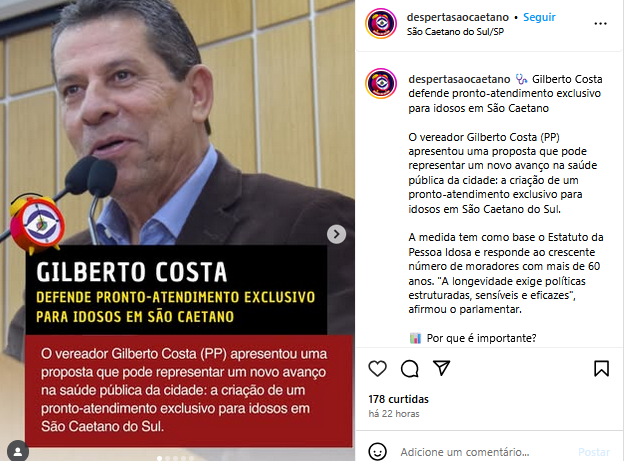 Gilberto Costa defende pronto-atendimento exclusivo para idosos em São Caetano
