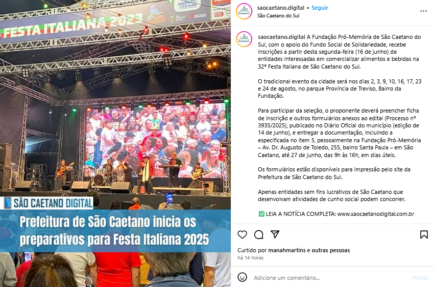 Veículo: Online -> Instagram -> Instagram São Caetano Digital