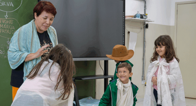 A turma do G5 ouviu atentamente a história de Romeu e Julieta, borboletas que descobriram junto com o amigo Ventinho que o mundo se une por meio de suas diferenças. Depois de escutar a narração de Cecília, foi a vez dos cerca de 15 alunos, de 4 e 5 anos, atuarem. Cada um escolheu um personagem, se caracterizou e reproduziu toda a história.
