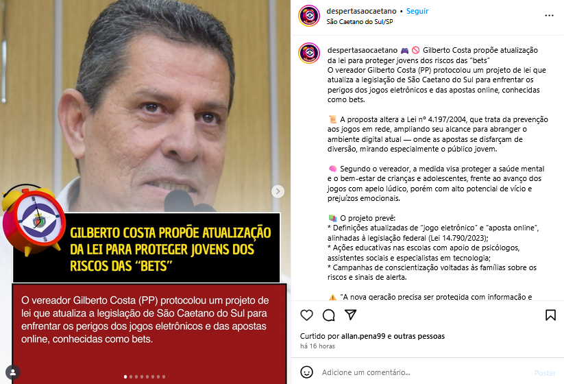 Gilberto Costa propõe atualização da lei para proteger jovens dos riscos das “bets”