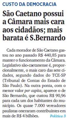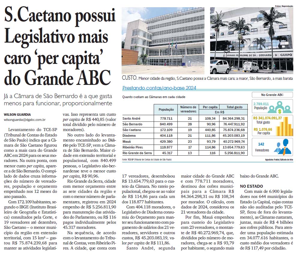 S.Caetano possui Legislativo mais caro ‘per capita’ do Grande ABC