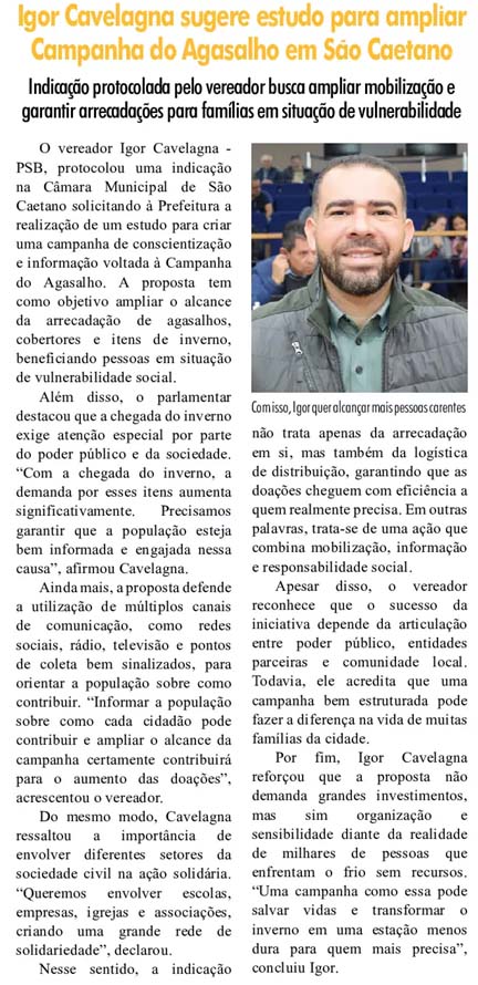 Igor Cavelagna sugere estudo para ampliar Campanha do Agasalho em São Caetano