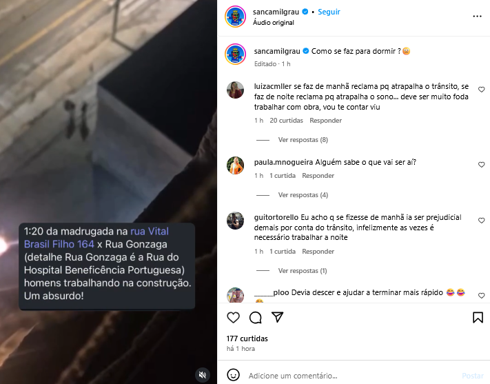 Munícipe de SCS reclama de homens trabalhando em construção de madrugada