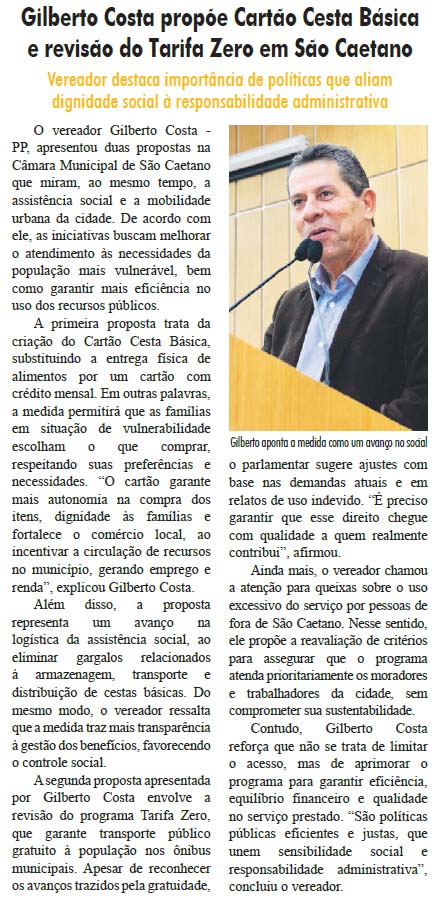 Gilberto Costa propõe Cartão Cesta Básica e revisão do Tarifa Zero em São Caetano
